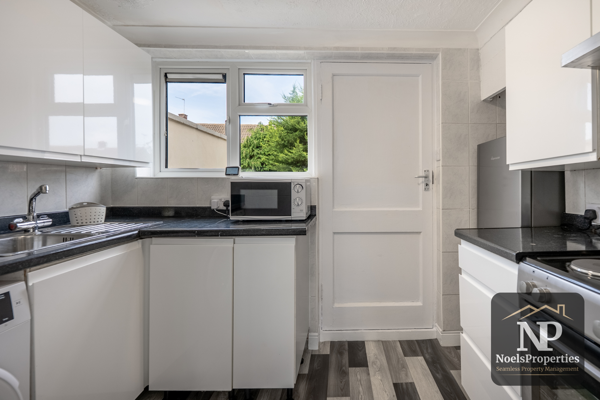 Large shared kitchen with two fridges and a washing machine